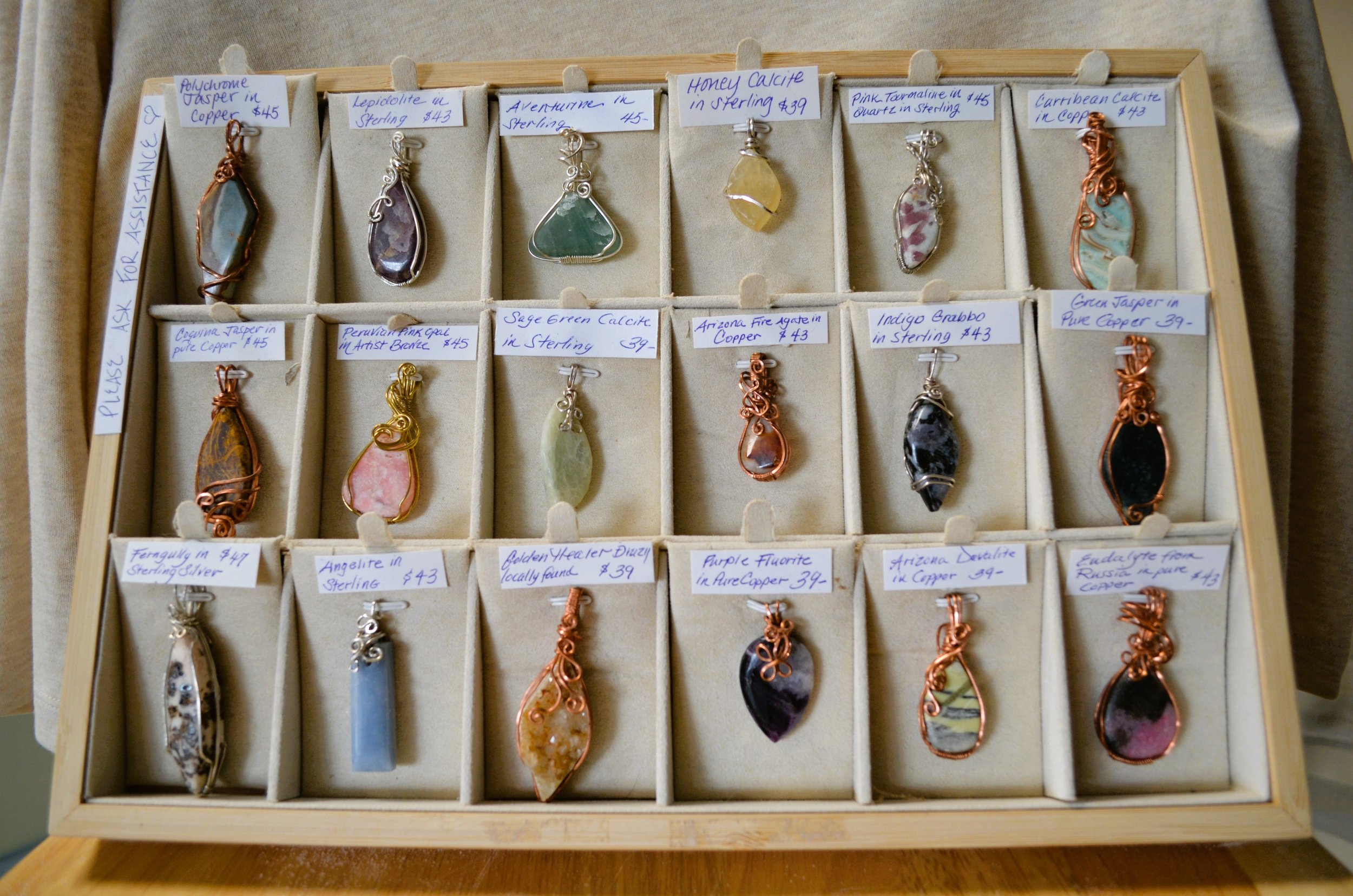A portion of inventory is supplied by the owner and her family through mining expeditions in and out of state. Our displays include crystals that Marianne, a self-taught Lapidarist, saw-cuts, shapes, grinds, and hand-polishes herself which are then made into jewelry or other items, in-store.